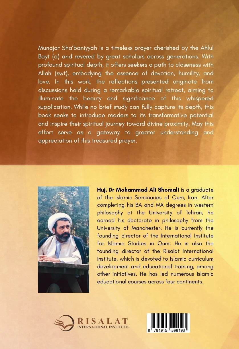 Munajat Sha'baniyyah is a timeless prayer cherished by the Ahlul Bayt (a) and revered by great scholars across generations. With profound spiritual depth, it offers seekers a path to closeness with Allah (swt), embodying the essence of devotion, humility, and love. In this work, the reflections presented originate from discussions held during a remarkable spiritual retreat, aiming to illuminate the beauty and significance of this whispered supplication. While no brief study can fully capture its depth, this book seeks to introduce readers to its transformative potential and inspire their spiritual journey toward divine proximity. May this effort serve as a gateway to greater understanding and appreciation of this treasured prayer.